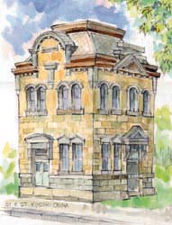窓の半円アーチや三角ペディメント、石の壁の重厚さ等格調高い美しい建物である。だが、長年の風雪による軟石壁面のしみや汚れが目立ち、痛々しい感じが第一印象である。近代的ビル、自動車騒音と排気ガス、時代の流れと人の価値観の変化の中、「孤立」を保つこの建物は「人間の営みや歴史は何か」を、合理主義や目先の利害のみにあくせくする現代人に問いかけている。 スケッチの趣旨を説明し、マイカーの駐車を心よく承諾してくれた隣の学校の職員の方、この建物への関心が感じられ意を強くした。 |