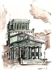 息を切らしながら坂道を上りきると、木立の中に白亜の洋館があらわれる。大倉山記念館である。 古典様式がベースというが、ファサードを飾る鳳凰や室内のいたるところに見られる菊の文様など、まさに和洋折衷の印象。上にいくほど太くなる柱が外観上の大きな特徴。室内に関しては修復の苦労の跡がみてとれる。階層ごとに異なる壁面の表現は外からの想像も及ばない。