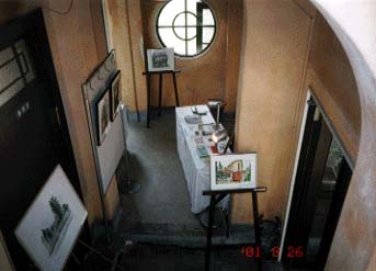 ここがスケッチ展の会場。大通りから長く急な坂を登りきった場所にある。建物内にはスケッチが所狭しと並べられていた。今回は自分の作品の他に、私が思いを寄せる作品が出品されていた。私の地元の新潟県上越市に在住の芸術家・舟見さんのドローイングである。お会いしてスケッチ展の話をすると、「ならばこれを」と渡してくれた。高田偕校舎、惜しくも取り壊されて、現存しない建物である。
