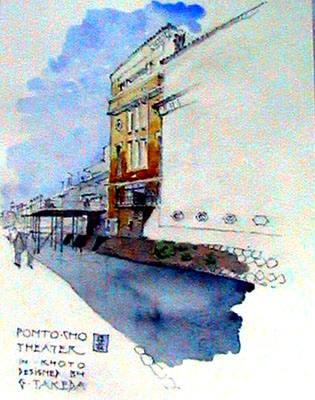 先斗町 歌舞練場/円満字洋介 所在地/京都府京都市 竣工/1927年 設計者/武田五一、木村得三郎(大林組) 先斗町と書いて「ぽんとちょう」と読む。この街は鴨川と高瀬川に挟まれている。川(かわ=皮)が両側にある鼓(つづみ)を連想して、打てば「ポン」となるから「ぽんとちょう」だという地名伝説がある。さて、武田はこの劇場をベネチア式に川に向かって開いた。そして建物上部を歌舞の神・ランリョウ王の伎楽面で飾りその両側に鼓をあしらったのだ。ゴンドラを浮かべてもきっとよく似合うであろう水上劇場のできあがりである。 |