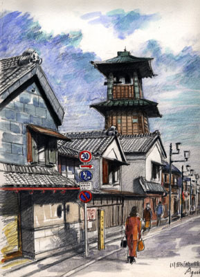 川越・時の鐘/堀田明嗣 所在地/埼玉県川越市 竣工/1917年 設計者//不詳 町並み保存が進み、「蔵の町」として観光客も多い川越のシンボルは「時の鐘」だ。鐘は旧多賀町(現幸町)の天台宗常蓮寺の楼内にあったもの。大火のあった明治26年の翌年に江戸時代の構造にならって再建された鐘楼の高さは、奈良の大仏と同じ17.65m。大工棟梁は関根松五郎、鐘の鋳造は鋳物師・矢沢四郎右衛門である。今日、鐘は電気仕掛けで午前6時、正午、午後3時、午後6時の一日四階、往時の響きを町に流している。 |