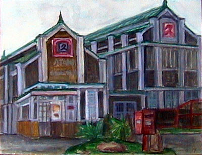 八丁味噌の郷/板羽紘一郎 所在地/愛知県岡崎市 竣工/1927年 設計者/不詳 岡崎に八丁味噌の郷がある。そこでは江戸時代から味噌造りがなされ、現在も踏襲されている。そこに、昭和2年に完成し、国の登録文化財として、平成8年に指定されている白い柱を強調した教会風の本社事務所がある。私はそこへ数回通って、場所や構図など設定しました。そして描き始めると思うように筆が運びませんでしたが、しかし、そこを行き通う人々に励まされて、いくらか気分よくスケッチをする事ができました。 |