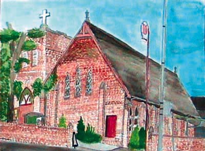 日本聖公会川越基督教会/河原隆志 所在地/埼玉県川越市 竣工/1921年 設計者/ガーディナーまたはウィルソン 川越で催されたスケッチ会。立派な蔵が立ち並び、そのスケールの大きさに圧倒され、スケッチできるかどうか不安になっていたところ、街の中心地近くの煉瓦造りの風情が気に入って、この教会を描くことにしました。この建物のように煉瓦の長い面と短い面を交互に並べて積み上げていく方法は、フランス積みと呼ばれ、川越市内の他の煉瓦塀にも見られます。川越の蔵作りのノウハウが、西洋建築にも活かされたということでしょうか。 |