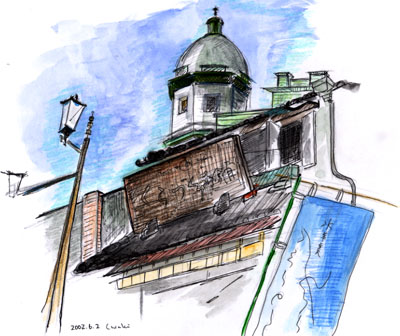 あさひ銀行川越支店/中嶋千秋 所在地/埼玉県川越市 竣工/1918年 設計者//保岡勝也 蔵造りの後ろに、高さ25mのルネサンス風ドーム「あさひ銀行」が見えた。川越の町並みを歩いているとき、ふっと振り返って見えた構図に思わず足が止まった。(洋風建築も心が引かれる・・・でも川越に来たからには蔵造りも描きたい・・・)迷いながら歩いた甲斐があって、望みの構図を見つけることができた。 |