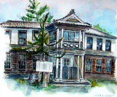旧岩井小学校/なかのさちこ 所在地/鳥取県岩美郡岩美町 竣工/1892年 設計者/不詳 6月9日(日)晴れ 静かで暑い午後。この建物は明治25年に岩井尋常小学校として建設された、鳥取県では現存最古の校舎である。岩井温泉という小さな温泉町にひっそりと建っている。大正6年、小学校が他地へ移転してからは、村役場、中学校、芝居小屋とアパート、工場など、時代とともに内部は改造され所有者も移ったが、外観はほぼ創建当時を現在に伝えている。 |