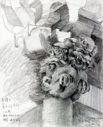 柴又帝釈天二天門/時森幹郎 所在地/東京都葛飾区 竣工/1896年 棟梁/坂田留吉、彫刻/加藤勘造ら 帝釈天は寛永6年(1629)草創ということですが、この二天門は明治29年(1896)建立のようですからこれでもよろしいでしょうか? また、いつものようにこんななってしまいました。正味3時間は描いたと思います。7時を過ぎて暗くなって見えなくなってきたので途中でしたが止めました。実は左側にももう一匹いるのです。こういうのを木鼻といって、これは獅子鼻というようです。 |