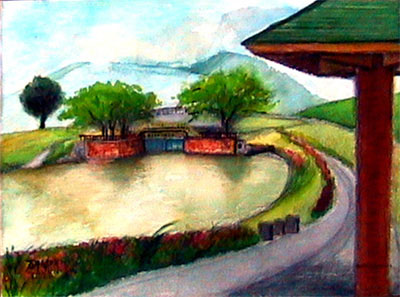 石井閘門/豊原みどり 所在地/宮城県石巻市 竣工/不詳 設計者/不詳 石井閘門は、明治11年の野蒜築港計画にともない、北上運河を開鑿した際に運河入口に設けられた。当時の土木局長石井正一郎の名を取り、石井閘門と名づけられている。石巻の井内石や東京のレンガを使用した当時一流の近代的技術の建造物で、今年3月に重要文化財の指定を受けた。現在、閘室部の上には橋が掛かっていて、私も子供の頃からそこを歩いていたが、閘門が何のためのものか深く考えることもなかった。水門として、活躍するところを見たことが無いせいもある。先日、5月に産業考古学会の総会に出席する機会があり、石井閘門の現状写真の撮影を依頼された。それで今年スケッチ展の画題にと選んだのだが、一般的な建物と違いどう描いていて良いのか、わからなくなってしまった。圧倒的な技術不足のほかに対象への思い入れが少ないせいも原因だと思う。それゆえに、締切も守れず脱力系のへろへろな作品になってしまった。最近、閘門周辺は、整備されてサイクリングロードや隈研吾氏設計の北上川・運河交流館(水の洞窟)ができて市民の憩いの場となっている。(絵の中では、東屋の屋根下に見える丘が交流館) |