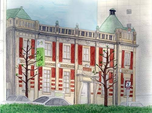 この数年京都には時々行くけれど、四条通りの方を歩くのは今回が初めてでした。四条大宮から烏丸通りまで歩きましたが、その途中ぽつぽつと近代建築があり、すっかり嬉しくなりました。この北國銀行は現役の銀行建築のようで、描きたいなと思ったのです。横浜の関内にあった近代建築の銀行が、どんどん締められてしまい残念に思うので、現役で使われている銀行にはエールを送りたい気持ちです。