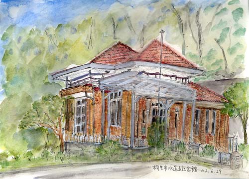 久しぶりに桐生へ出かけた。以前描いた桐生明治館を描きたいと思っていたら修復工事の為すっかり布でおおわれていて残念。水道山記念館もモダンな建物だ。水道山公園の入口にあり、ハイカーが足ならしにはよいハイキングコースなのだと話していた。