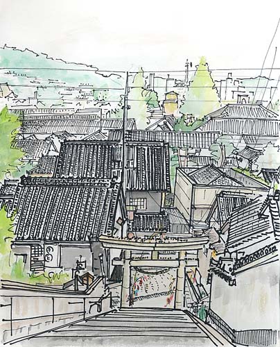 倉敷の町並みを上から見下ろすと、見事に居並ぶ瓦屋根の間から以外にも多くの緑が顔を出していることに、新鮮な発見を感じて描いてみました。参道の下にある本町通りの、ゆったりとした生活の気配を感じながら、石段に腰掛けての夏のスケッチは心地よいものでした。
