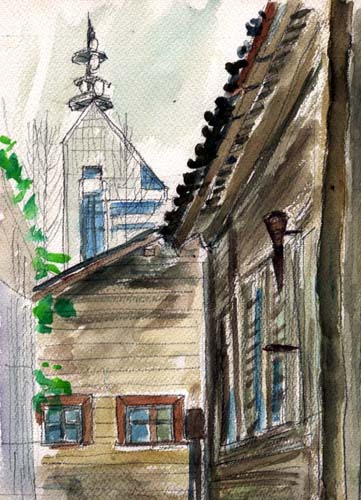 スケッチした建物は改修もれになった部分のようで、瓦は落ちそう、雨どいも途中からなくなっています。魯迅が学んだ校舎のとなりにあり、遠くの仙台で一番のっぽの近代ビルと古い建物の対比に心ひかれスケッチ、間にメタセコイアの並木の上の方が見えます。