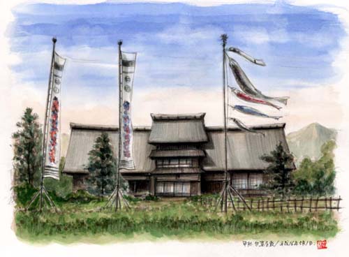 大棟を東西に通した切妻造りの茅葺屋根(現在は銅板茅)。南面中央に二段の突上げ屋根を設けており、甲州古来の特色を遺憾なく発揮した構造である。 また山梨地方では五月の節句になると、鯉幟と共に武田信玄由来の武者幟が立てられるのも、独特の風物詩となっている。(江戸時代中期の建築と伝えられる・重要文化財)