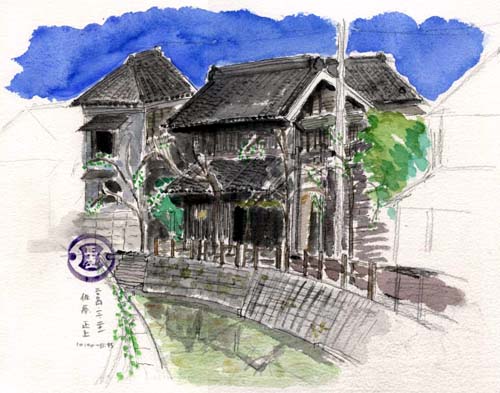 第四期(2003年度)神楽坂美術塾の最後の講座で訪れた佐原のまちなみは、穏やかで懐かしいものでした。この正上(しょうじょう)さんの店舗は江戸時代、袖蔵は明治期の建築。 (千葉県有形文化財)