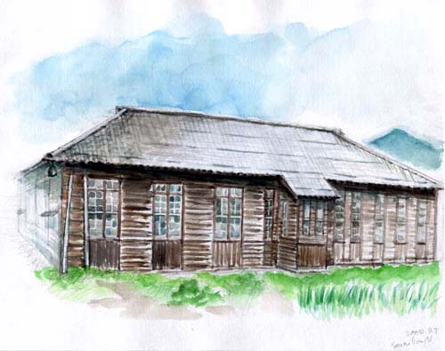 スケッチに出かけた日は、真夏を思わせる日差しでした。緑の水田の上を風が渡る小鹿谷は、静かな、小さな集落です。小鹿谷公民館は、昭和3年に建てられた鳥取家庭裁判所が、この地に解体・移築されたものだそうです。今も公民館として活用されていますが、静かな集落の中で、建物の存在感は大きく、堂々としています。昭和初期の木造裁判所建築としては全国でただ一つ現存するものだそうです。あまりの暑さに小学校以来と思われるほどの日焼けをして帰ってきました。