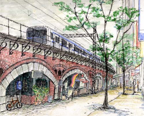 土曜日 PM2:00 炎天下。 目の前にはドイツビールの店。 以前本で見たベルリン市内を走る環状鉄道のレンガ造りの高架橋とイメージが重なる。ドイツに来てスケッチしている気分に浸っていると、近くにある”もつ焼き屋”の煙と匂いが鼻をくすぐり、有楽町界隈の現実へ・・・。 でも、新橋から神田・御茶ノ水へ続くレンガ造りの高架橋も町並みに馴染んで、それなりの風情があっていいのでは・・。