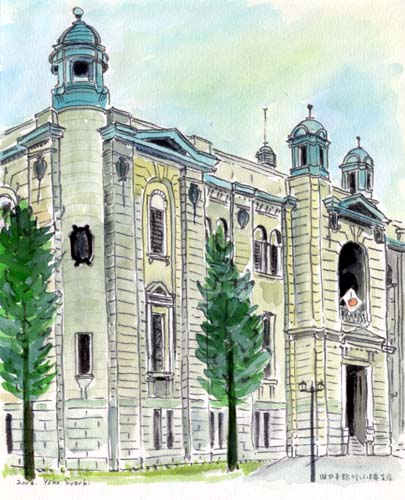 昨年夏念願かない、明治から昭和初期の建物が数多く残されている小樽を旅することができた。どこを描いても絵になる風景に感動し、何枚かのスケッチを楽しんだ。まず目に止まったのがウォール街のこの建物。美しいドームと重厚な外観に魅了され、筆ペンタッチで夢中で描いた。東京駅の設計者辰野金吾の設計でルネッサンス様式を取り入れている。外壁はレンガの表面にモルタルを塗り、石造り風に仕上げているのが特徴。