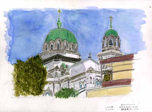 今はビルに囲まれて窮屈そうに建っていたけど、昔は眺めが良く皇居まで見ることができたとか…… 緑色の鐘楼から響く音が暑い日差しの中でスケッチをする僕の心を和ませてくれた。偶然ドラマの撮影現場にもなっていて、貴重な体験をした。