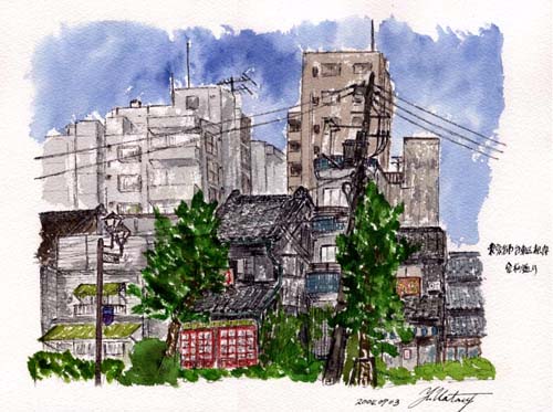 以前は、路面電車も走った金杉通りで、幾つもの懐かしい建造物があったのだが、新しいビルが建ち始めて数少なくなってしまった「さつま揚げ屋」と「提灯屋」です。最近その中の一軒の「さつま揚げ屋」が店じまいをして、壊されてしまう不安から描きました。