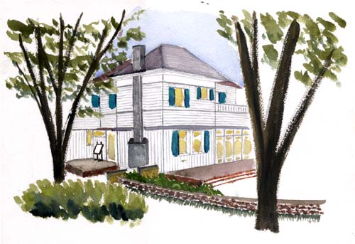 今日は、神楽坂美術塾で月に一度のフィールドスケッチの日だ。場所は横浜山手。とりわけこの日を楽しみにしていたのは、僕の好きな建築家アントニン・レーモンド設計の住宅を見られるからだ。元町・中華街駅から小高い丘を上りきり、外人墓地を通り過ぎると、緑に囲まれたエリスマン邸が見えてくる。外観と内観を1時間かけてぐるぐる見ていると、描きたい気持ちがだんだん湧き起こってくる。蒸し暑さの中、2時間で勢いよく描いた。