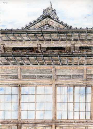 建物の西側にある庭園に足を踏み入れると、鬱蒼とした木々に囲まれ、スポットライトのような木漏れ陽が差していて、幻想的な美しい空間でした。 その中に身を置き、建物の意匠の美しさや時折訪れる優美な蝶や蜻蛉に心奪われつつスケッチしました。 「利根川の流れに面して遠く妙義の奇峰や浅間の雲を眺めて風光絶佳であるから」選ばれたこの地に、前橋に初めて建てられた迎賓館のすぐ隣に貴賓館として建てられた臨江閣別館。先人の誇りや気概を感じる建物でした。