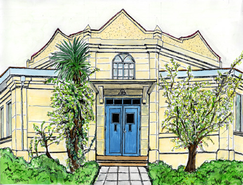 鎌倉は私の好きな場所でよく訪れる。江ノ島電鉄の線路沿いに教会があり、その裏にハリス記念幼稚園が建っていた。鎌倉で最も古い幼稚園。左右に突き出したところは教室、真ん中はホールになっている。無駄な飾りがなく品が良い。この幼稚園の建物から醸し出されるやさしい雰囲気を描きたく、スケッチした。