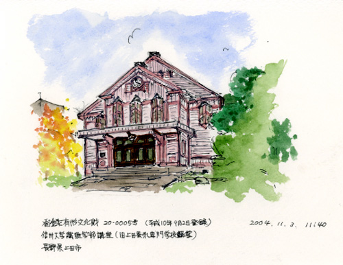 夫の母校です。上田市の知人宅へお参りに行った時、寄ってみたいというので訪れました。日曜で学生もほとんどおらず、この講堂が印象的なので描く事にしました。 三角の張り出し窓がおしゃれで下見板が美しいと思いました。
