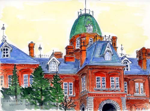 明治21年に約250万個のレンガを用いて造られたアメリカ風ネオバロック様式の建物。「赤レンガ」の愛称で親しまれて、国指定重要文化財。 念願の札幌フリープランの旅で、日本の近代建築の代表である「赤レンガ」をスケッチすることができ、大変嬉しく思っている。観光客が多すぎて、場所選びには苦労したが、どこから描いても、どこを描いても絵になる建物、また機会があったら何枚かスケッチしたい。