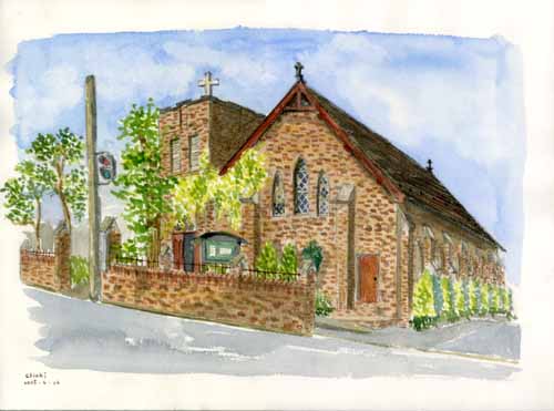 とにかく暑い日、古い町並みが残ると聞き川越に行きました。道を抜けたところに突然ぽん、と立っているこの教会が眩しく見えて、ここを描くことにしました。小さいのに堂々とした姿に引き寄せられるようです。 描いていると、書道の大先生というおばあさんに話し掛けられたり、信号待ちの車から家族連れに声を掛けられ、絵を見せると「わぁっ」と拍手をもらったり。描くことで、思いがけぬ出会いがあるのが楽しいです