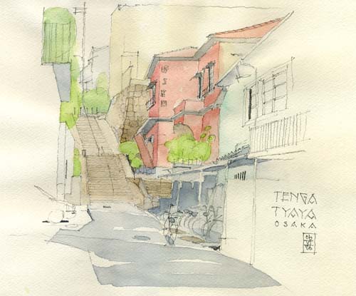 大阪の阿倍野区天下茶屋あたりは坂が多い町です。そこには戦前の長屋や銭湯がたくさん残っています。坂を上がり下りしていると、町がドラマチックで楽し過ぎます。この赤いアパートは坂の途中に建っていました。手前のアパートは緑っぽいタイル張りです。どちらも玄関の床はモザイクタイルで飾られていました。こんなおしゃれなアパートのある町はそうはありません。天下茶屋はちょっと不思議で素敵な町です。