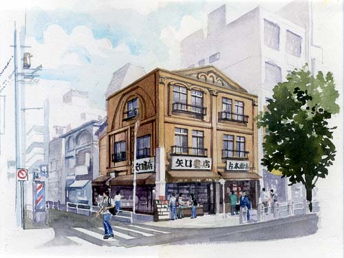 今回、作品の対象として、選んだ建物は、神保町靖国通り沿いの矢口書店です。その理由、なるべく偉そうでなくて、心に訴える何かあるもの(その何かが重要なのだが遊び心とでも言えばよさそうです)そこで私が、よく歩きまわっている神保町界隈の、古本屋の店舗などのファサードの看板建築を選択しました。初めは藤森輝信さんの書かれたそのタイトルの本を見てなるほど英語でBillboard