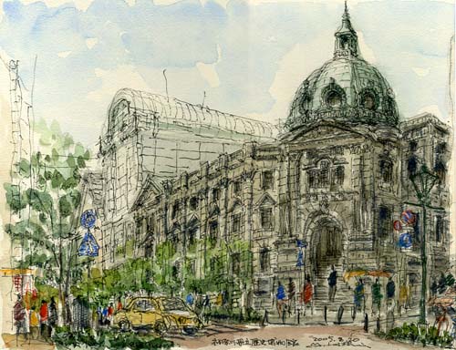 横浜には明治大正時代に建設された多くの近代建築がありました。しかし、近年は「再開発」と言う目的のために解体建替えが進み、その数も減りました。その中でも、この神奈川県立博物館は保存再利用の好例です。旧横浜正金銀行本店を改修し、博物館として再利用している建築です。銀行ホールの高い天井を利用し、展示スペースに使っています。その石積みの壁、青銅色のドーム屋根など、まさに横浜馬車道のシンボルです。真夏の暑い日、汗を拭きながら二時間、楽しいスケッチでした。