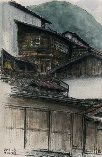 ひとつづきの建物である。建物が石垣を飲み込んでいる。 鉱山の町神岡は、高原川の河岸段丘がつくった擂鉢の底にある。 複雑な地形に密集した家並みが独特の風景をつくり出し、鉱山で栄えた豊かさ が偲ばれる町でもある。 大坪酒造店は天保13年創業。江戸時代の酒蔵に始まって、増殖を重ねてきた 建物は今も現役。丁寧に作られた地酒の味は格別。ぜひ一度ご賞味あれ!