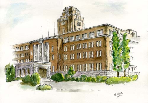 昭和5年に建設された近世ゴシック建築様式の旧茨城県県庁本庁舎。現在は、生涯学習センターとして県民に開放されています。 威圧的なレンガ張りの重厚な建物ですが、その雰囲気を出すのには、スケッチの初心者として苦労しました。