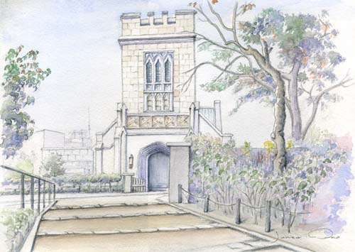 横浜の歴史的建造物としての教会はカトリック山手教会、横浜指路教会、横浜海岸教会とこの横浜聖公会の4棟がある。いずれも市民にとって昔から馴染みの深い建物で、戦災、昨年の火災と二度にわたる災害を受けながら復活を果たし、戦中戦後現代とめまぐるしい変貌を遂げた横浜の街を見下ろしている。傷跡も残すことなく佇むその端正な姿を描きとどめたいと秋深い山手公園からスケッチした。