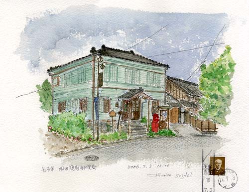 知多木綿の産地として古くから栄えた岡田町には、多くの土蔵や石垣、レンガの壁・なまこ壁など、昔の面影を残す街並みが見られます。その中に明治時代の雰囲気をただよわせている建物が「岡田簡易郵便局」です。明治32年開設され、昭和41年閉局まで70年近く営業を続け、その後一時倉庫として使われ、取り壊しも検討されたのですが、町の歴史を残すものとして、平成5年「岡田簡易郵便局」として再生されました。スケッチをしていても次から次と人の出入りがあり、町の人々に愛され使われているのを見るとうれしくなりました。
