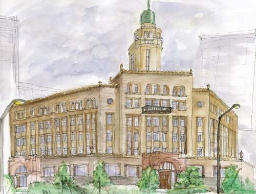 5階建てのエキゾチックな庁舎には「ロマネスク」などの西欧建築様式が混在し、それをベージュ色の磁器タイルが優しく覆っています。イスラム寺院を想わせる緑青色のドームは「クィーンの塔」の愛称で親しまれています。正面玄関には見事な造形美の半円形のアーチがあり、庁舎の主要なモチーフになっています。