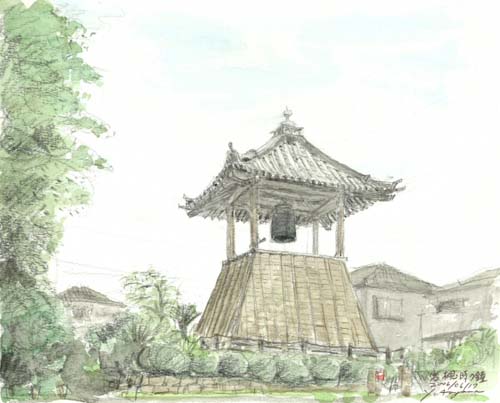 城下町でもあり日光御成街道の宿場町でもある岩槻。この「時の鐘」は、水郷に浮かぶ平城だった岩槻城に隣接した大地の端にあります。高さは、周りの二階建ての住宅より屋根だけ高い程度。かつてはほとんど平屋だったでしょうから、遠くまで鐘の音が響いたにちがいありません。今でも朝と夕に撞かれているそうで、寛文11年(1671年)に設置され享保5年(1720年)の改鋳とありましたので、330年あまりに渡って時を刻み続けている、岩槻のシンボルです。