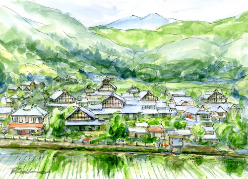 旧宮崎村は、切妻屋根集落の多い農村地域である。 戦前は藁葺き屋根であったが、純朴で勤勉な村人たちの性格と、戦後の高度経済成長に支えられ、瓦葺き屋根に葺き替えられた。囲炉裏の名残である越屋根も所々に見られる。 山の緑に包まれて、美しいそして温もりのある、農村風景である。この景観を後世に伝えていきたいと思う。