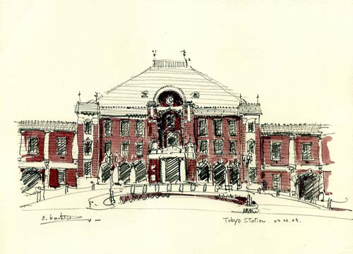 昭和の東京駅は今年いっぱいで見おさめです。 第2次世界大戦で破壊され、仮復旧したのですが、これも歴史。 実は、創建当時の歴史より長い歴史でした。 その思い出としてスケッチしました。