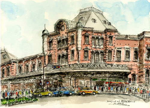 数年ぶりで東京駅を描きました。この間、駅前は大きく変わりました。旧国鉄ビル、丸ビル、新丸ビルと建替えが進み、東京中央郵便局の建替え高層化の計画も動きはじめたようです。たとえ高層ビルが林立しても、その存在感を失わないのがこの東京駅です。年内には改修工事も始まるそうで、今の姿は今回が見納めになりそうです。数年後には俊工事のオリジナルに近い姿で完成するそうです。大きく変わるのは屋根の形状で、まっすぐな屋根から柔らかいデザインの屋根に変わります。見慣れた姿がどのように変わるのか、楽しみです。これも建物保存の手法なのでしょうか。