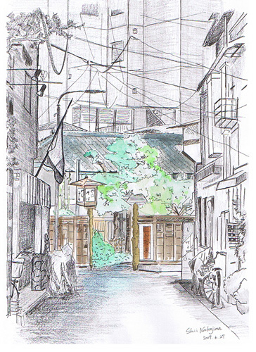 木造 2階 都選定歴史的建造物 今年も梅雨の晴れ日を狙ってスケッチ。日焼け止めクリームのせいで4Bの鉛筆がすべる。淡路町に何軒か残る老舗店、どれも趣きがあるが周りのビルとの調和が悪い。甘味竹むらへ向かう路地、ふっと振り返った藪そばに、やっと足が止まった。