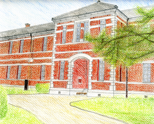 旧制第五高等(現・熊本大学)の前進である、第五高等中学校の校舎として明治22年に完成した建物である。現在の密集した住宅地帯の中で、周囲を森に囲まれた赤煉瓦の建物は百年以上たった今でもなお色鮮やかでどっしりとした風格を漂わせている。スケッチをしながら眺めていると、建物の威容に当時の建設に携わった人々の情熱や真撃な姿勢が伝わってくるようで、私自身も真剣に描きたいという気持ちになった。