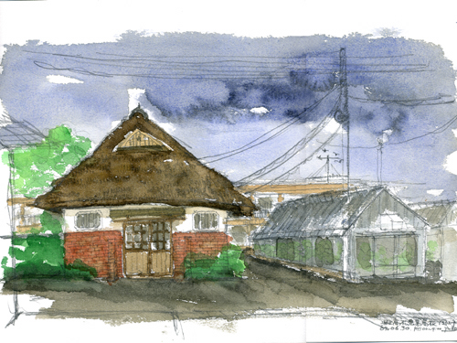 県立高松農業高校資料館。岡山市。 旧県立農学校の堆肥舎として明治42年建立。 屋根は茅葺き。壁はレンガのフランス積み、上部シックイ塗りという珍しいデザイン。登録有形文化財。