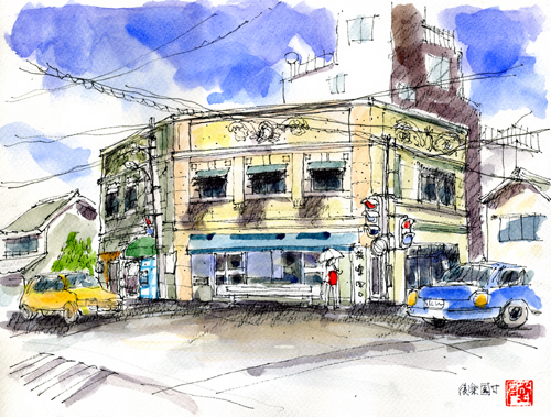 場所は岡山市出石町界隈で、後楽園の入口交差点の一角になります。 この出石は画家、国吉康男の誕生の地であり、又戦災をまぬがれた、昔の建物もまだ残っております。 この大正ロマン風の建物も作者、年度など不明ですが、今現在は喫茶店、ブティック、美容室などのテナント商業建築として使われています。当時何に使われていた建物なのか、興味を引きますが、今はこの交差点の顔(シンボル)にもなっています。