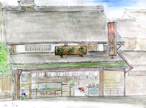 阪急電車京都線桂駅東口から、歩いて15分あまり行くと”桂離宮”に着く。すぐ横は桂川である。このあたりは、古都条例により開発が制限されている為、あまり様変わりしていない。よく遊んだ離宮外庭、友禅流しを見ながら泳いだ桂川。懐しく想い出す。 『中村軒』は離宮の南、桂大橋西詰めにある。昔から変わらず町のまんじゅう屋に徹し、手作りのものを売っている。スケッチをしながら、次々と訪れる客を見て、嬉しくなった。