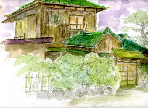この家は、昭和11年頃、別荘として建てられました。平成元年に、増築されましたが、古い部分はそのまま残されました。古い部分の内側はその時、きれいにされたそうです。実際の建築の環境は、沢山の庭木に囲まれていて、特に松の古木が多いです。緑の屋根は今でも珍しく美しいです。ガラスの明かりとりの窓は、特に時代を感じます。