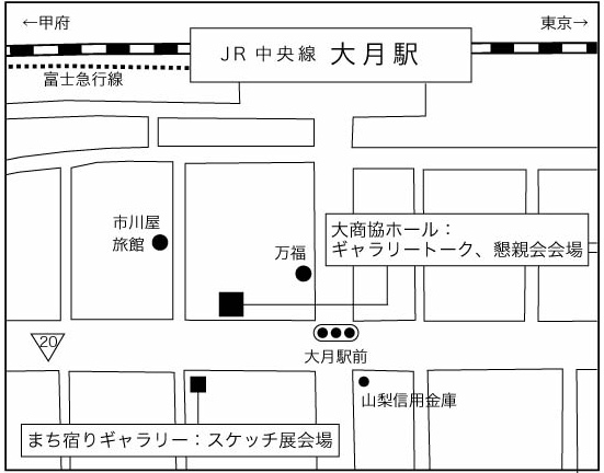 | ■イベント内容 9月20日(土) 1.大月スケッチ会 集合時間 10:00 集合場所 大商協ホール前 山梨県大月市大月1-8-13 2.ギャラリートーク 時間 16:00より 場所 大商協ホール2階 パネリスト 小俣孝氏(大月商店街協同組合理事長) 大窪恭子氏(大月展実行委員長) 宮本和義氏(写真家) 鈴木喜一(建築家・神楽坂建築塾塾長) 3.懇親会 時間 18:00より 場所 大商協ホール2階 参加費 2,000円 9月21日(日) 4.大月スケッチ会 時間 10:00(日帰り参加者合流) 場所 大商協ホール前 5.講評会 時間 14:00より 場所 大商協ホール2階 ※イベント当日連絡先:080-6725-1859(事務局携帯) ■宿泊施設(参考までに) ※宿泊される方は各自で宿の手配をお願いしております。 〈大月市内〉 ・市川屋旅館(大月)/1泊朝食付き/TEL:0554-22-0403 ・万福(大月)/素泊まり/TEL:0554-22-0686 〈大月市外〉 ・大和屋旅館(初狩)/TEL:0554-25-6020 ・ビジネスホテル泉谷(都留市小形山)/TEL:0554-43-8940 |