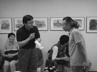 「歴史的建造物を愛情を込めて描くことで、保存のメッセージを伝えよう」と、1993年から始まった近代建築史への旅スケッチ展。19回目となる今年は、東京―大月を結んでの開催となります。東京・神楽坂では、展示準備中からオープンを待ちきれない来場者が覗きに来てくれました。歴史的建造物への意識の高さを反映しています。全作品がインターネット上で閲覧できるウェブ展もオープンしました。 |