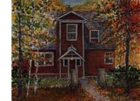 小春日和が惜しまれスケッチへ出かけた。郊外に来ると新しい雪がうっすらと景色をおおい、記憶にあった建物が一層目をひく。自ら設計にも係わった思い入れが何処となく伺える、そんな居心地のよさ……。 作家として知られるが私にとっては絵心を持つ彼の一面がうれしく思え、勝手に親近感を抱いた。 お天気に誘われたはずなのにじっと立っていると身にしみて冬の到来を感じてしまう。日も暮れかかり間もなくあかりを灯されると、そこにはほのぼのとした家の表情が見え、冷えきった体が一瞬暖かくなった。 高橋美千代