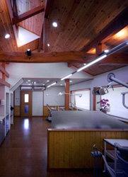 まず詳細な実測調査・構造検討を行い、部分的な補強を施せば既存躯体はじゅうぶん再生可能であることがわかった。特に、「水害を防ぐために高くつくった床下」のおかげで土台部分の腐朽がほとんど見られなかったことも幸いした。工事はまず南側の住居棟の新築から着手し、診療棟については一部を解体して壁(小舞+左官壁)を取り除いた後、隣地境界から間隔をあけるためにジャッキアップを行い、約1メートル北東に曳き家した。診療室は既存部分と増築部分にまたがり、二階建て部分の前者は平天井・平屋にあたる後者はトップライトのある屋根勾配なりの板張り天井とした。
